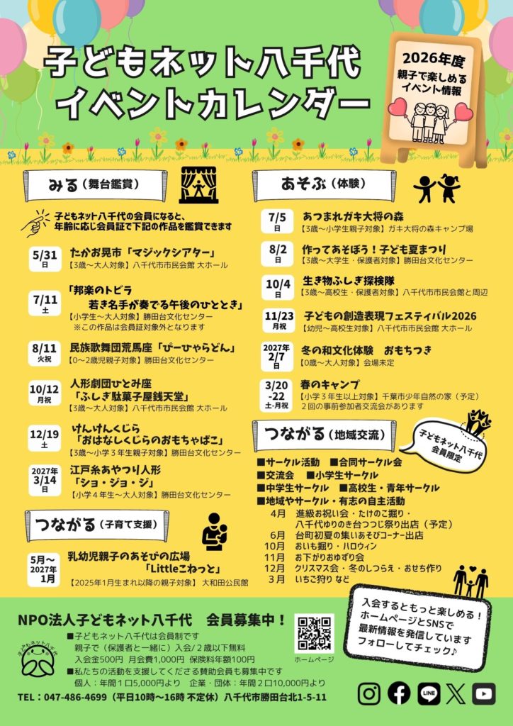 みる 【入会受付中】2026年度も親子で楽しめるイベントがいっぱい! 子どもネット八千代は①みる(舞台芸術鑑賞)②あそぶ(体験活動)③つながる(地域交流・子育て支援・異年齢交流)の3つを活動の柱とし、親子で楽しむ会です。 親子で一緒に楽しみたい 舞台鑑賞が好き、プロのアーティストと出会いたい 個人ではできないあそび体験をしたい、習い事とは違う「体験」の場が欲しい 非認知能力を育てたい 子... 2026年3月1日