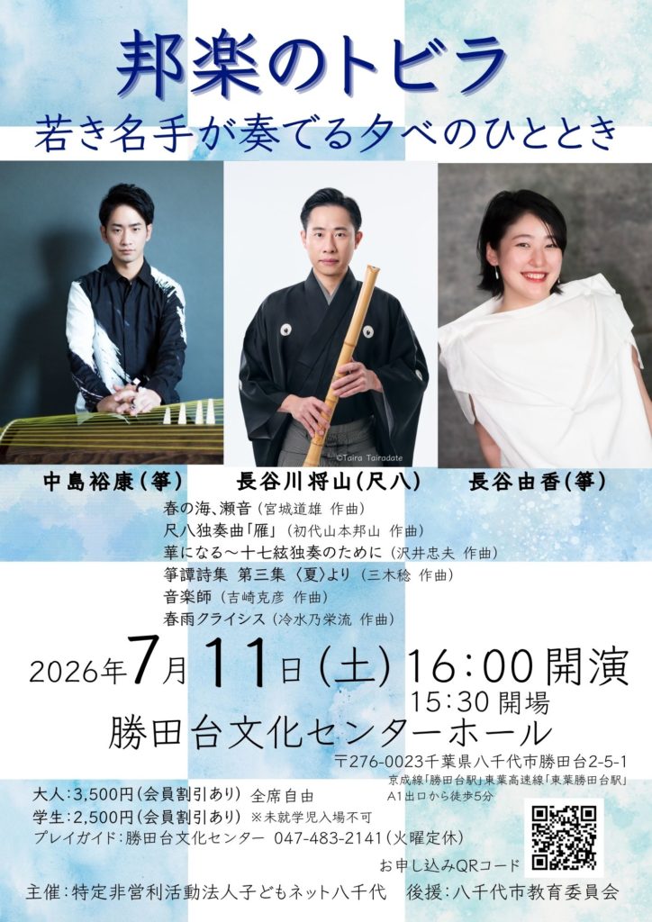 NEW! みる 【受付中】邦楽のトビラ 若き名手が奏でるタべのひととき 2026年7月11日(土) 16時開演 勝田台文化センター 「邦楽のトビラ」を開く、贅沢なひととき 箏・尺八・十七絃・二十絃箏 多彩な邦楽器が織りなす誰もが知る名曲から、息を呑むほど斬新な現代曲まで 演奏の合間には、奏者の素顔が見える楽しいトークも 伝統の枠を超え、あなたの知らない新しい「邦楽のトビラ」 ぜひお楽しみく... 2026年4月7日
