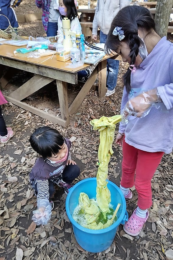 今回は、秋も深まる森で、プレーパークや森のようちえんからお二人の講師の方に来ていただき、草木染めを体験しました。