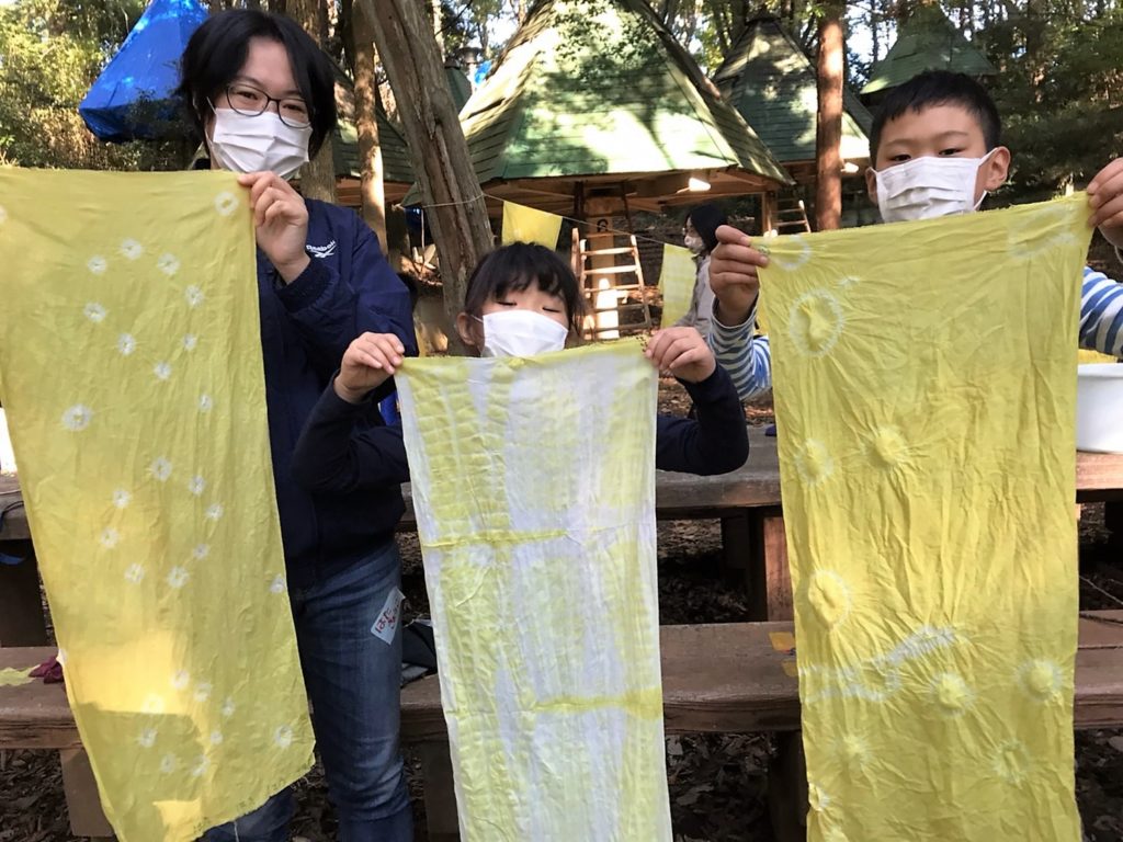 最後に干して乾いたら完成!黄色いハンカチが森の中で風に揺れ動く様子は、とても絵になります。セイタカアワダチソウ色の自分だけのハンカチに、みんな笑顔いっぱい。
