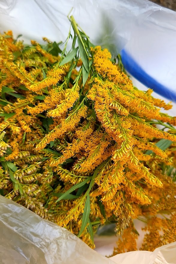 はじめにみんなで森を出て、お散歩をしながら、田んぼの脇道にたくさん生えているセイタカアワダチソウを摘みました。何気ない道にもたくさんの植物が生えていて、オナモミを集めたり、ちいさなお花を見つける子も。