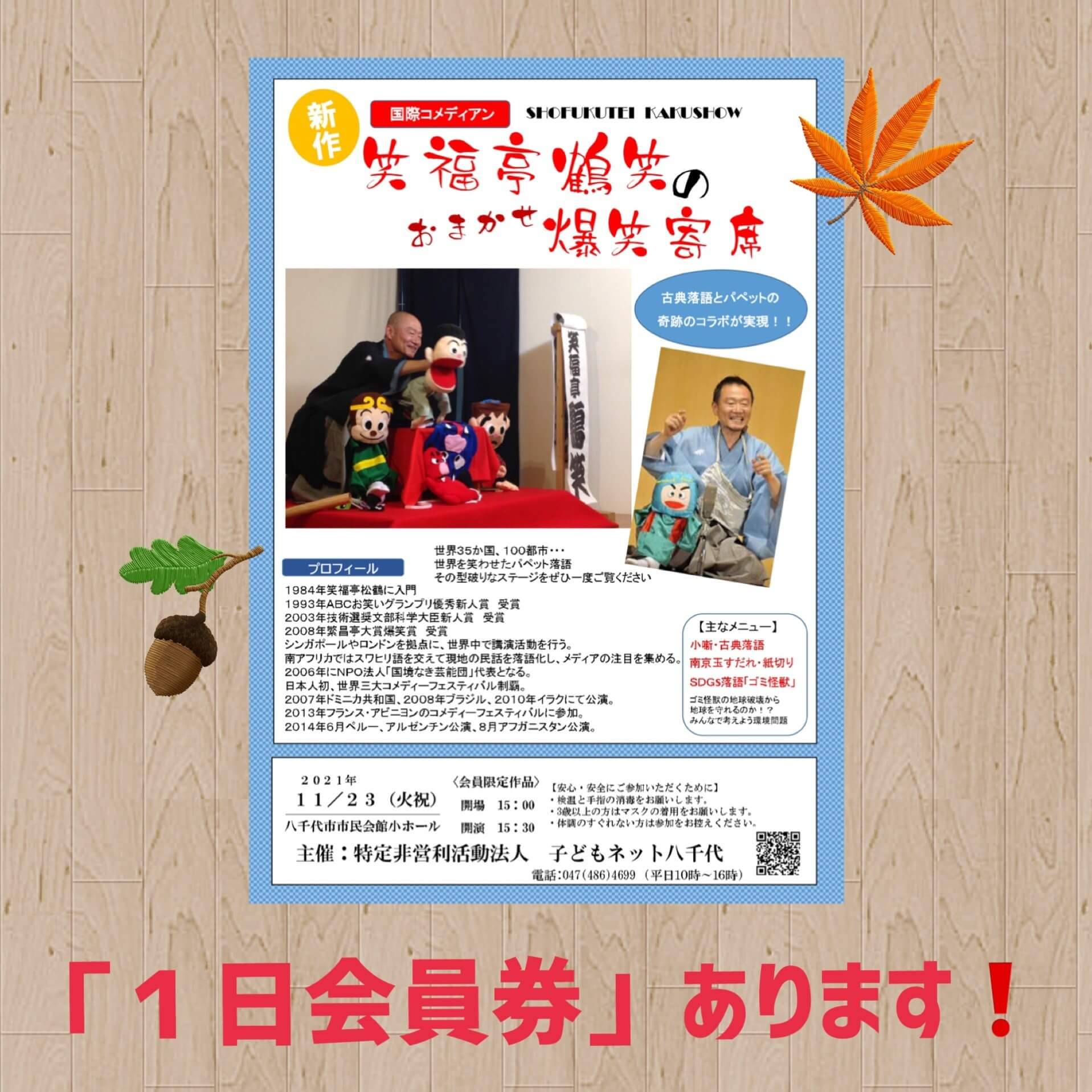↑チラシ裏面では落語豆知識をお届けしていますが、こちらに鶴笑師匠の活躍が良く分かるサイトを紹介します。「笑い」への思いや、幅広い活躍を知ってますます公演を楽しみましょう!