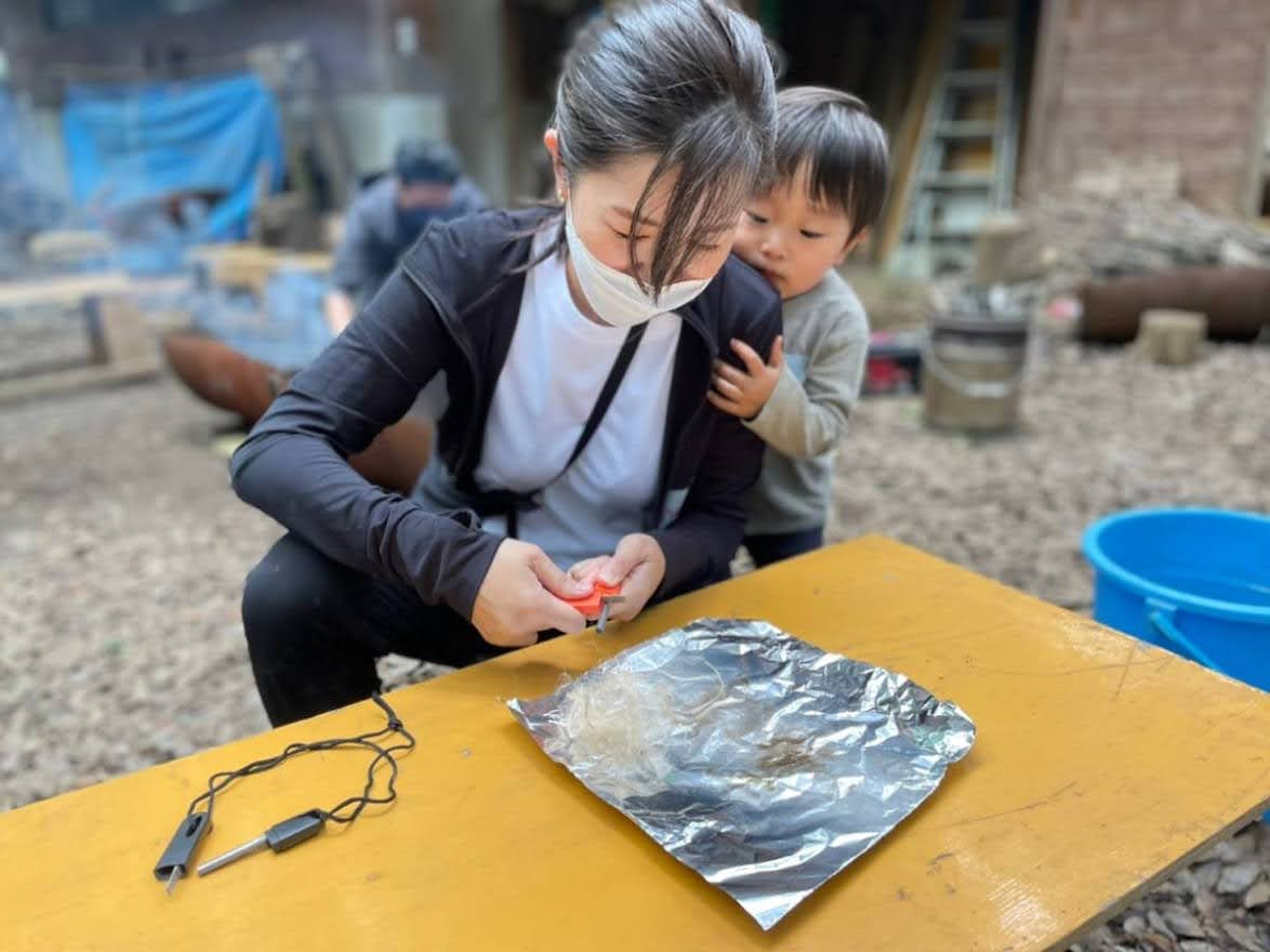 麻ひもを細かく割いてフワフワの繊維を作り、ファイヤースターターで火をつける作業はなかなか一筋縄ではいきません。何度も試行錯誤を繰り返し、やっと火がついた時の子ども達の得意げな顔が印象的でした。