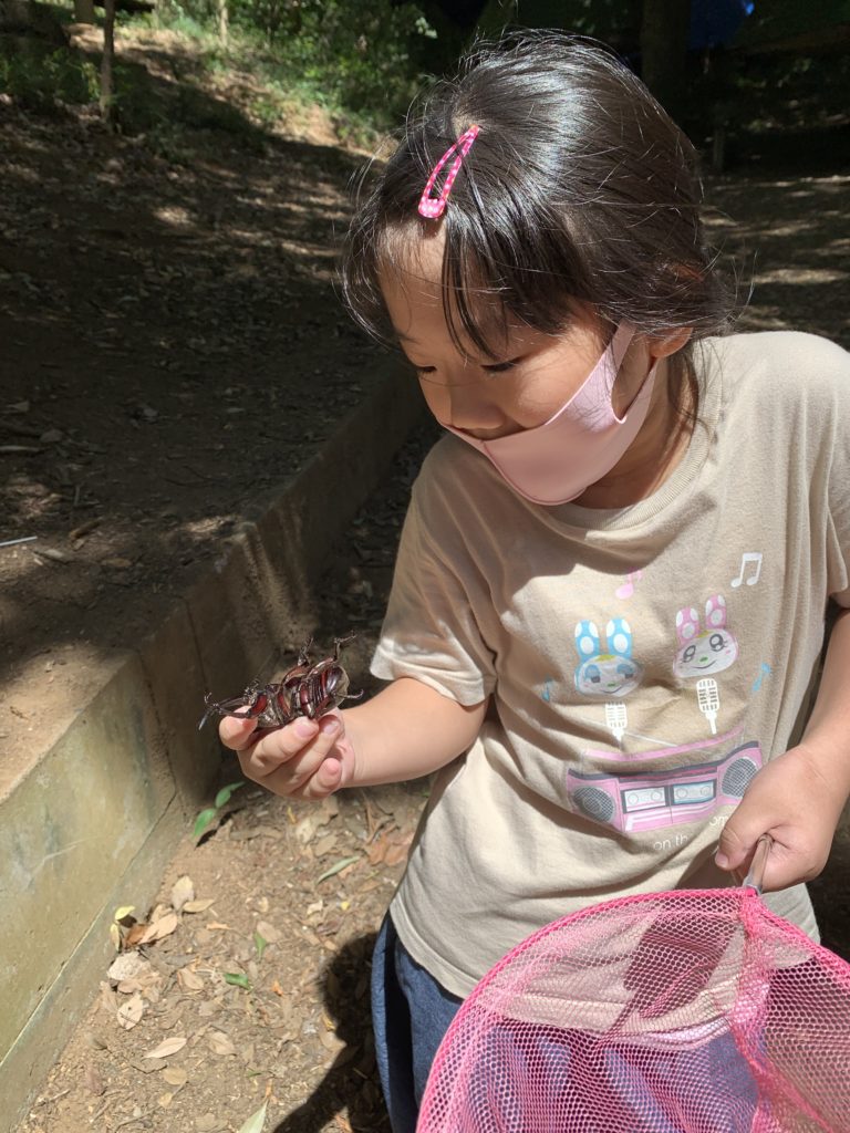コロナで、外にでる機会の少ない子どもたちも、ココならおもいっきり走れ回れます。森の中には、あまがえる、くわがた、やもり、かまきり、セミにしらない小さな昆虫たち。生き物が身近にいるってことは当たり前なのに、なんだか不思議です。