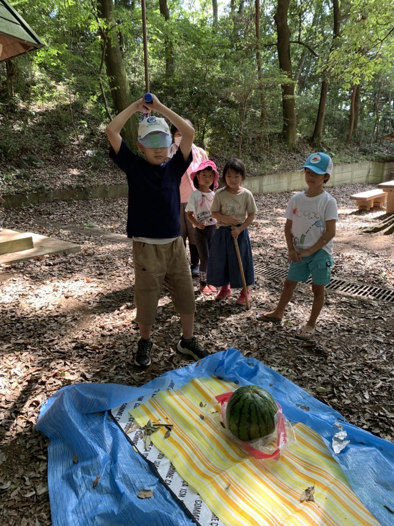 そして、スイカ割りです。目隠しをして、右!左!そこだっ!何周もして、ようやく割れました。