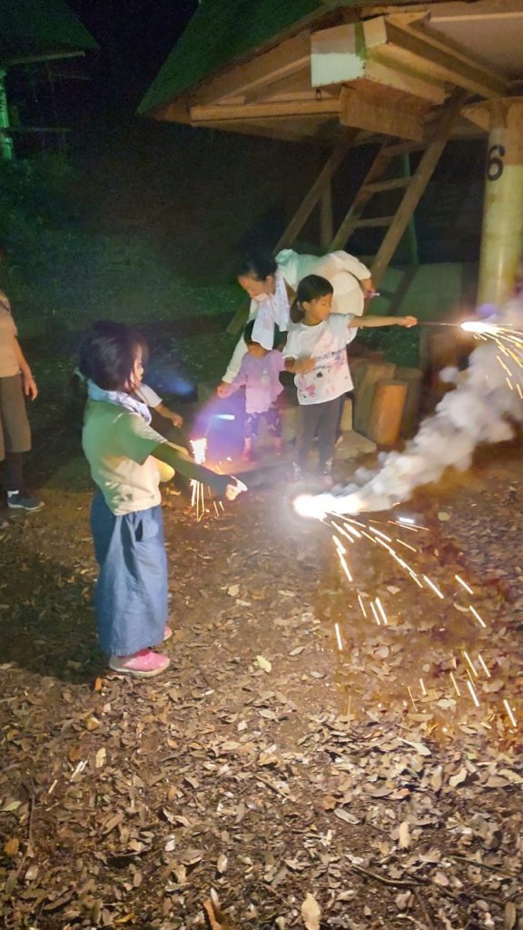 夜には、花火をしました。キャビンの中は寝苦しかったので、時々夜風にあたったり、虫たちの鳴き声を聞いたりしながら、朝を迎えました。