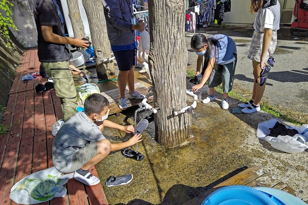入所式を行い、班ごとに部屋に分かれて、しばらく休憩かと思いきや、子どもたちは、自分たちの水着を洗ったり、干したり・・・と忙しい。それでも、あちこちで、カードゲームをする輪ができていました。