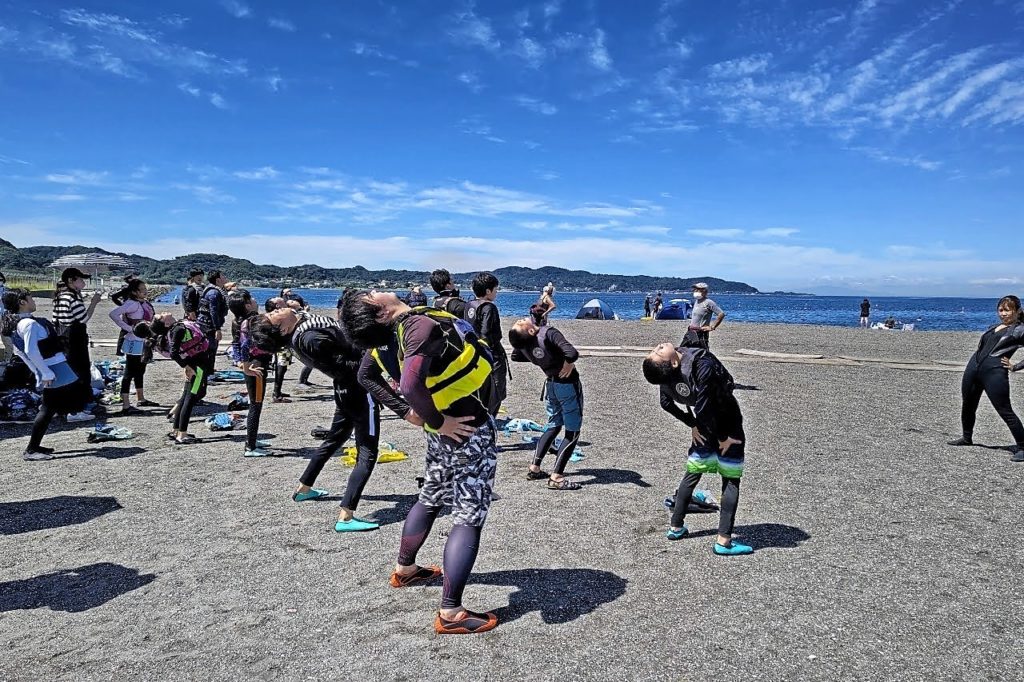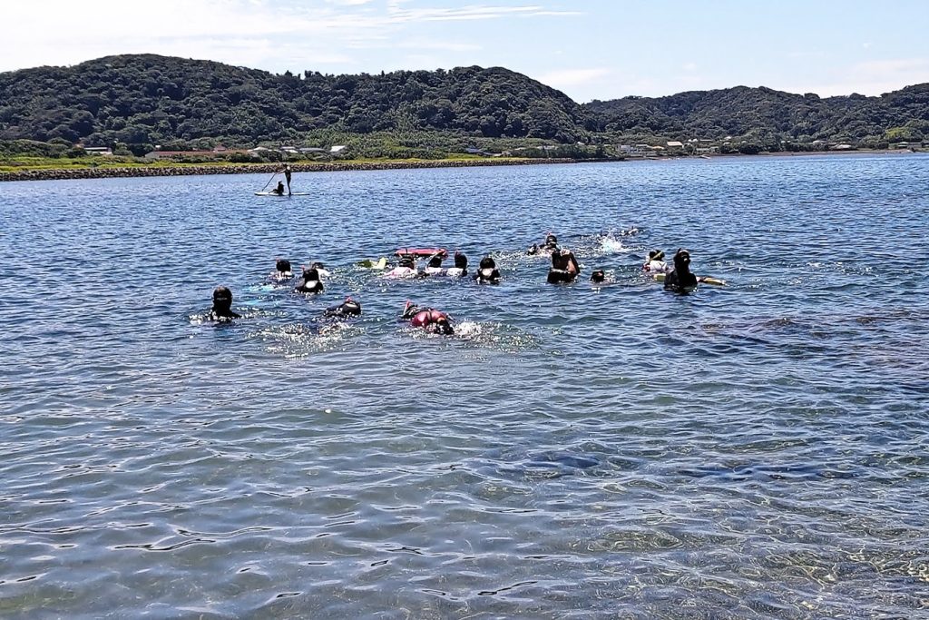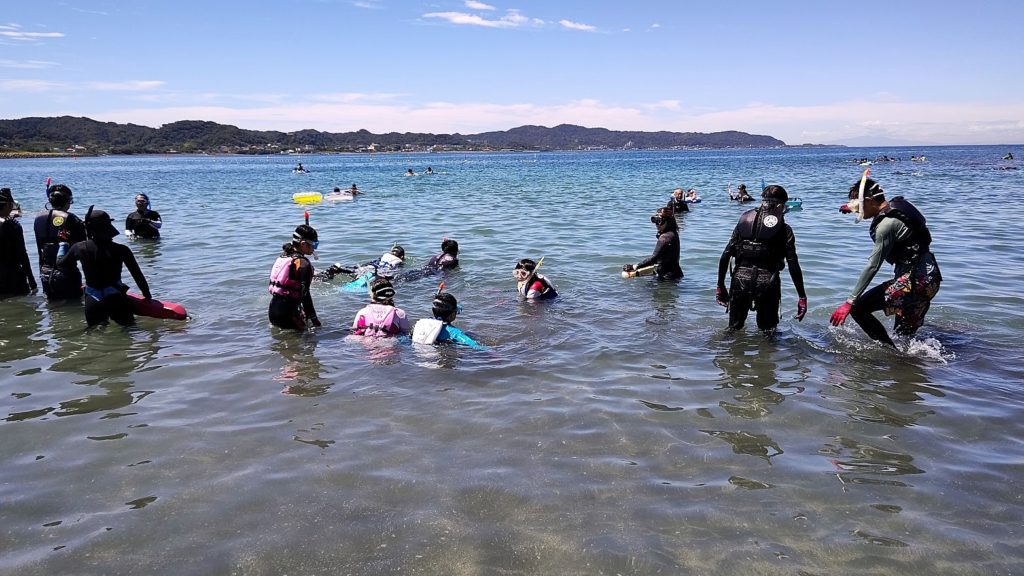 まず、準備運動をしてから2つのグループに分かれて、海の中で一緒に行動するバディを決め、マスクとスノーケルを身に付けて、いよいよ海の中に入ります。しばらく波打ち際でバシャバシャと潜る練習をした後は、フィンを付けて沖の方へ。フィンがあるせいか、あっという間に遠くまで行ってしまった子どもたちを見ていた待機組の大人スタッフからは「いいなあ」「楽しそうだなあ」という声が上がっていました。