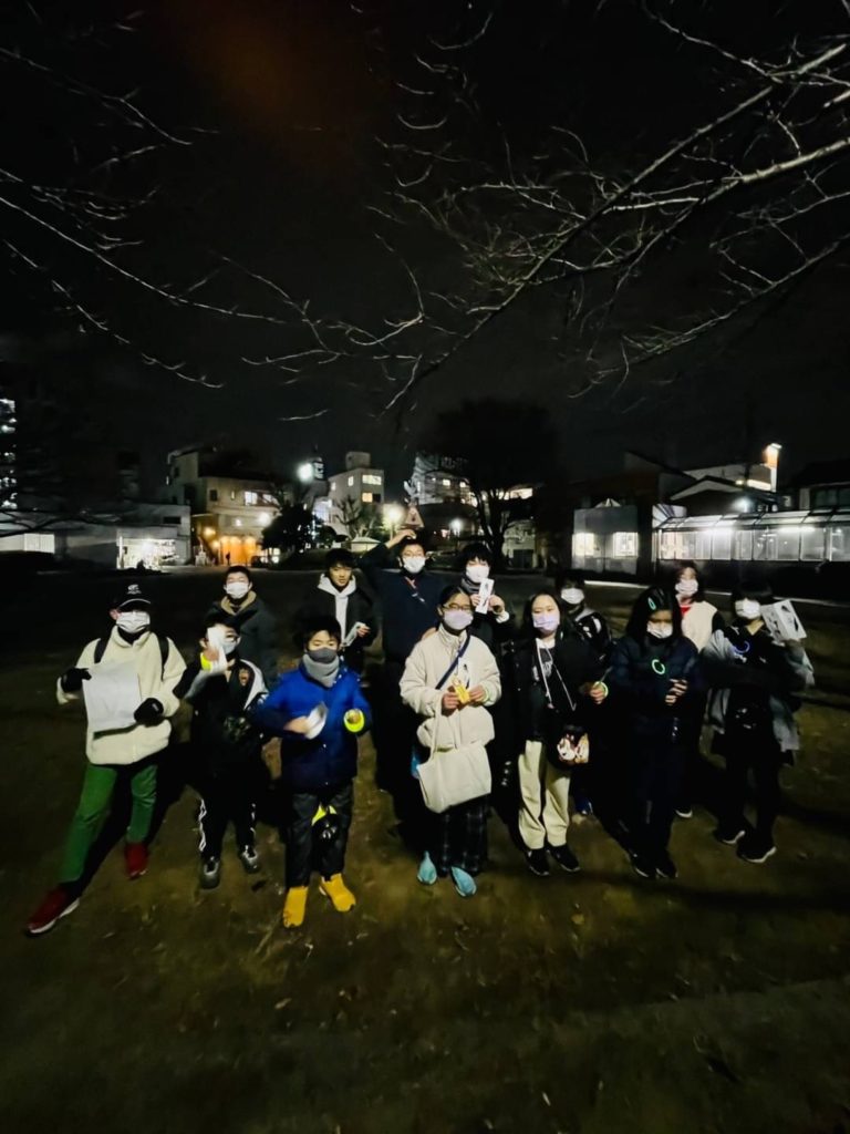 少しの間、夜の公園の遊具で遊んだり、中学生と小学生が混ざって走ったり、と交流。