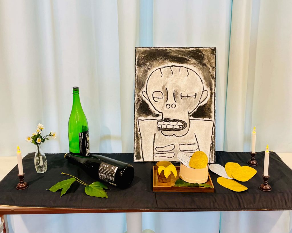 ロビーには、死神をモチーフにした金銀の小判、酒、ロウソクを飾ったフォトスポットを設置。これらは、ひかり萱田サークルさんに協力してもらいました。取り組む中で、「死神」の話をたくさんしました!この死神の絵も秀逸です。