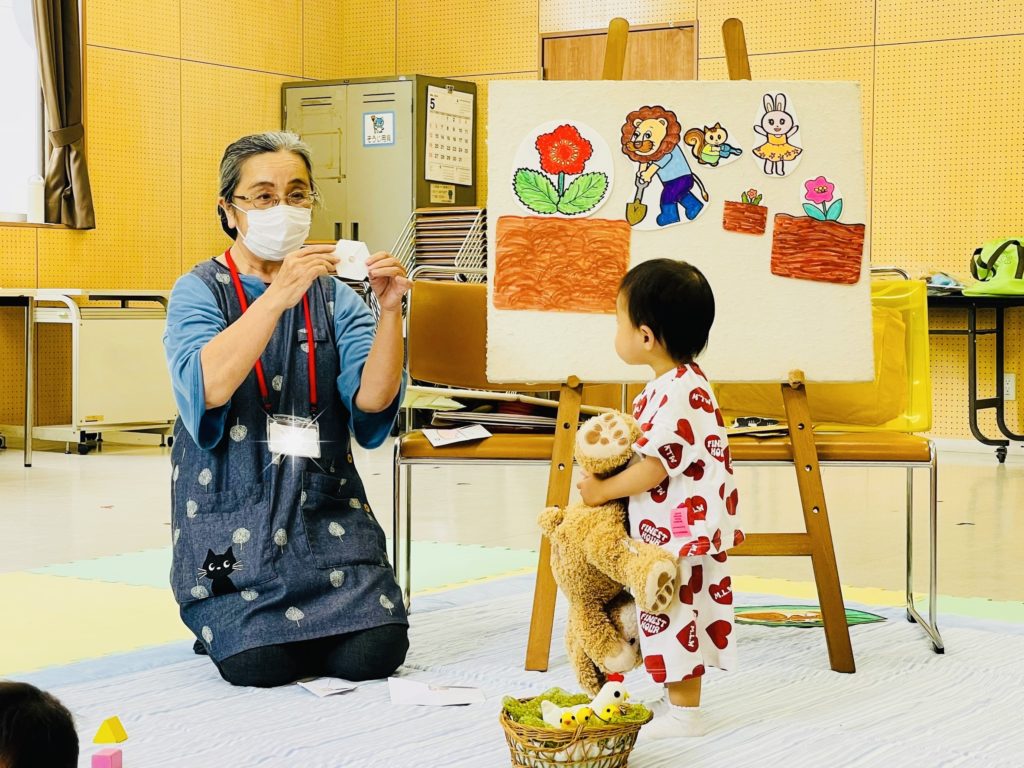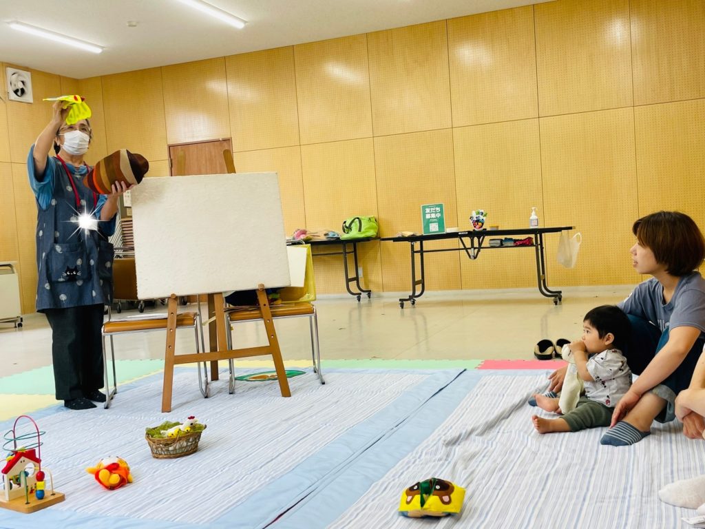 1歳を過ぎた子どもたちはパネルの中のお話に目を向け、0歳の子どもはそんなお兄さんお姉さんをジーっと見ていて、とっても微笑ましかったです。
