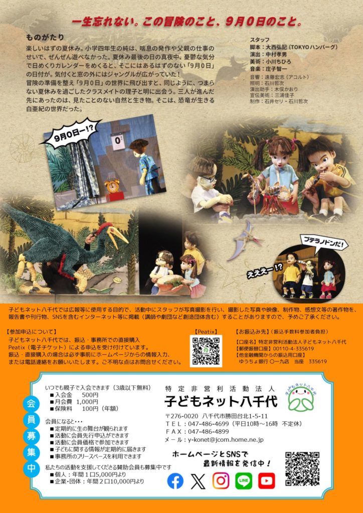 ※子どもネット八千代では広報等に使用する目的で、活動中にスタッフが写真撮影を行い、撮影した写真や映像、制作物、感想文等の著作物を、報告書や刊行物、SNSを含むインターネット等に掲載(講師や劇団など創造団体含む)することがありますので、予めご了承ください。