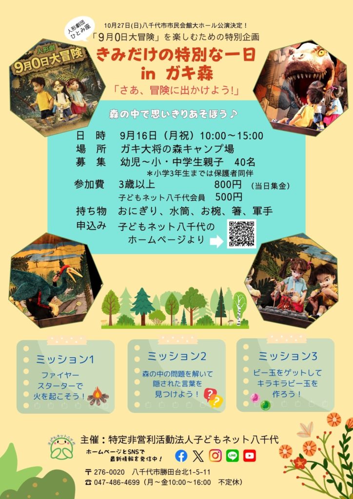 10月27日(日)に八千代市市民会館大ホールで上演する人形劇団ひとみ座「9月0日大冒険」の世界観をヒントに企画しました。自然いっぱいの通称「ガキ森」で、思いきり「冒険」しよう!