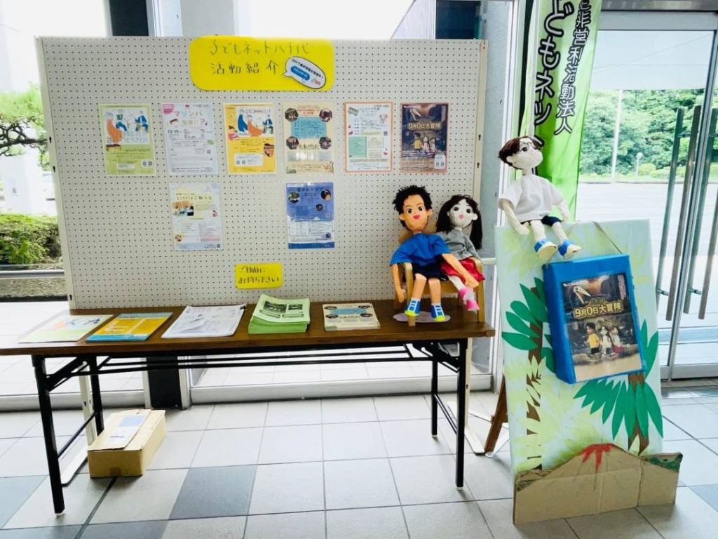 子どもネット八千代ブースでは次の鑑賞会、人形劇団ひとみ座の「9月0日大冒険」のPR!
