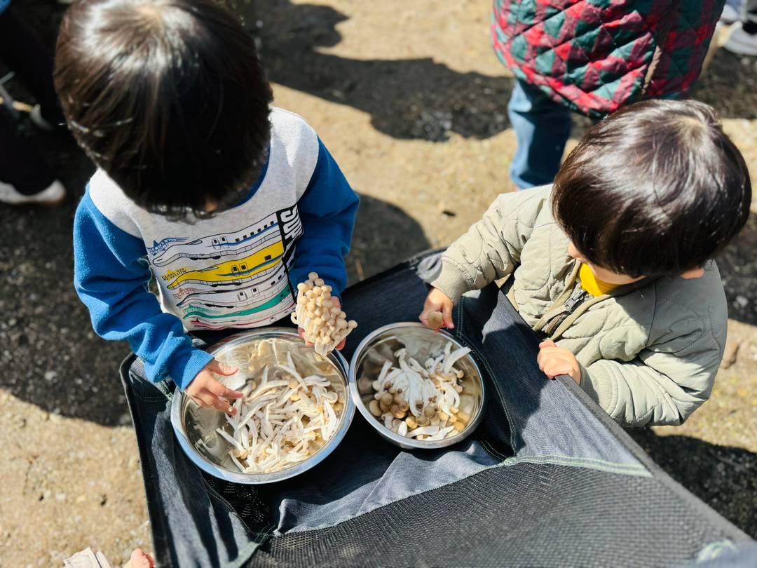 小さい僕だってお手伝い!しめじをかわいい小さい手でほぐしていきます。こんにゃくだって手でちぎります。