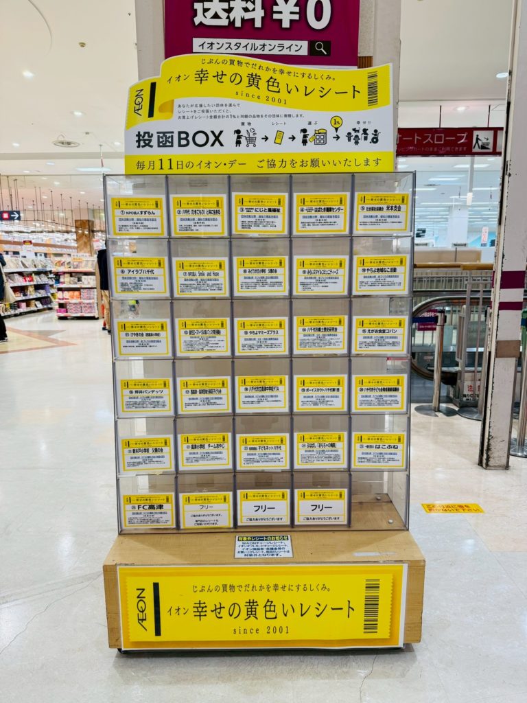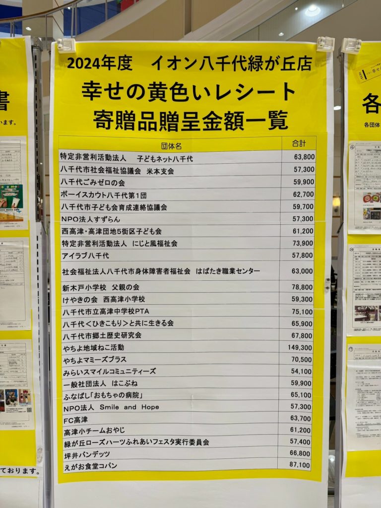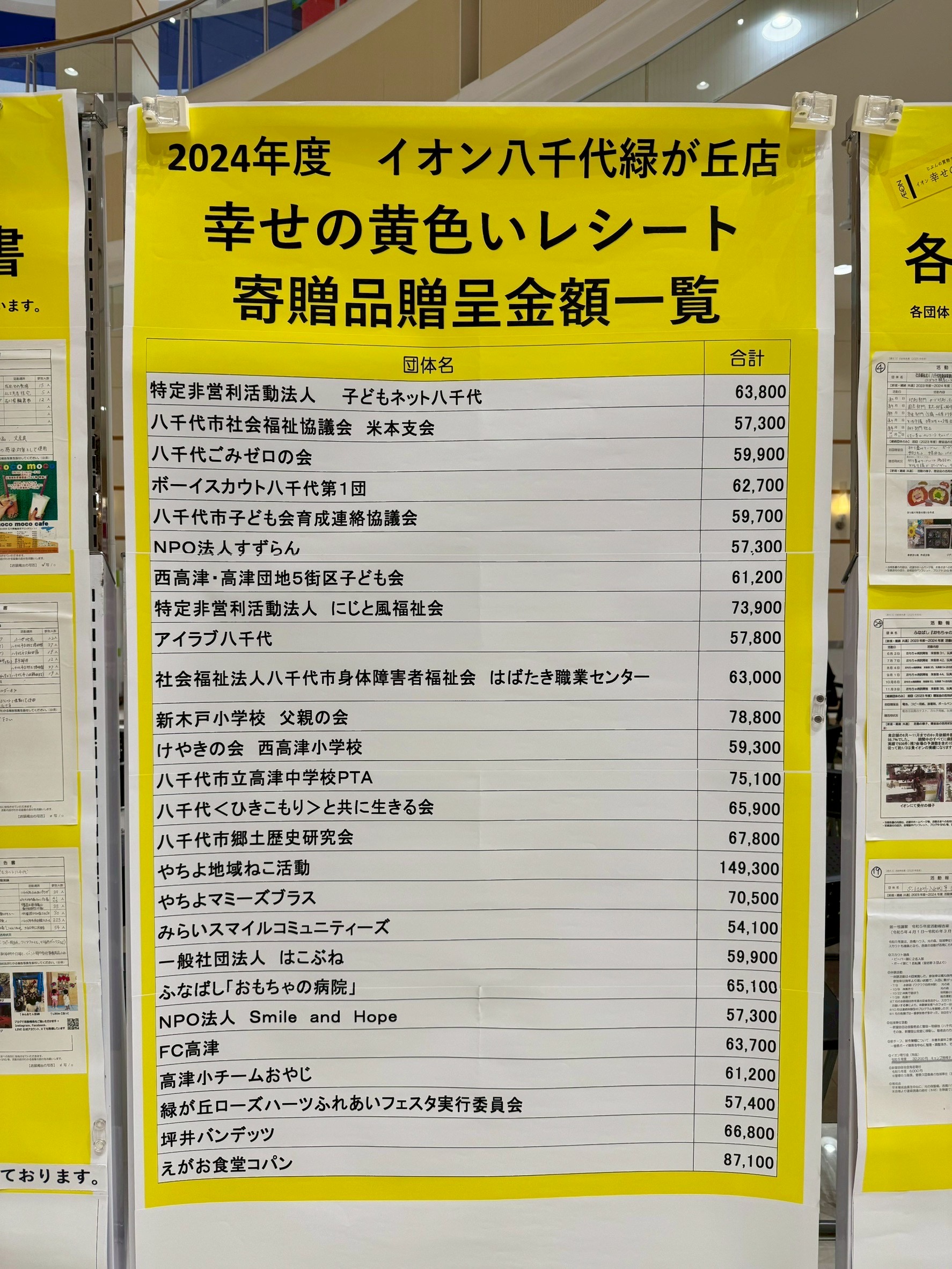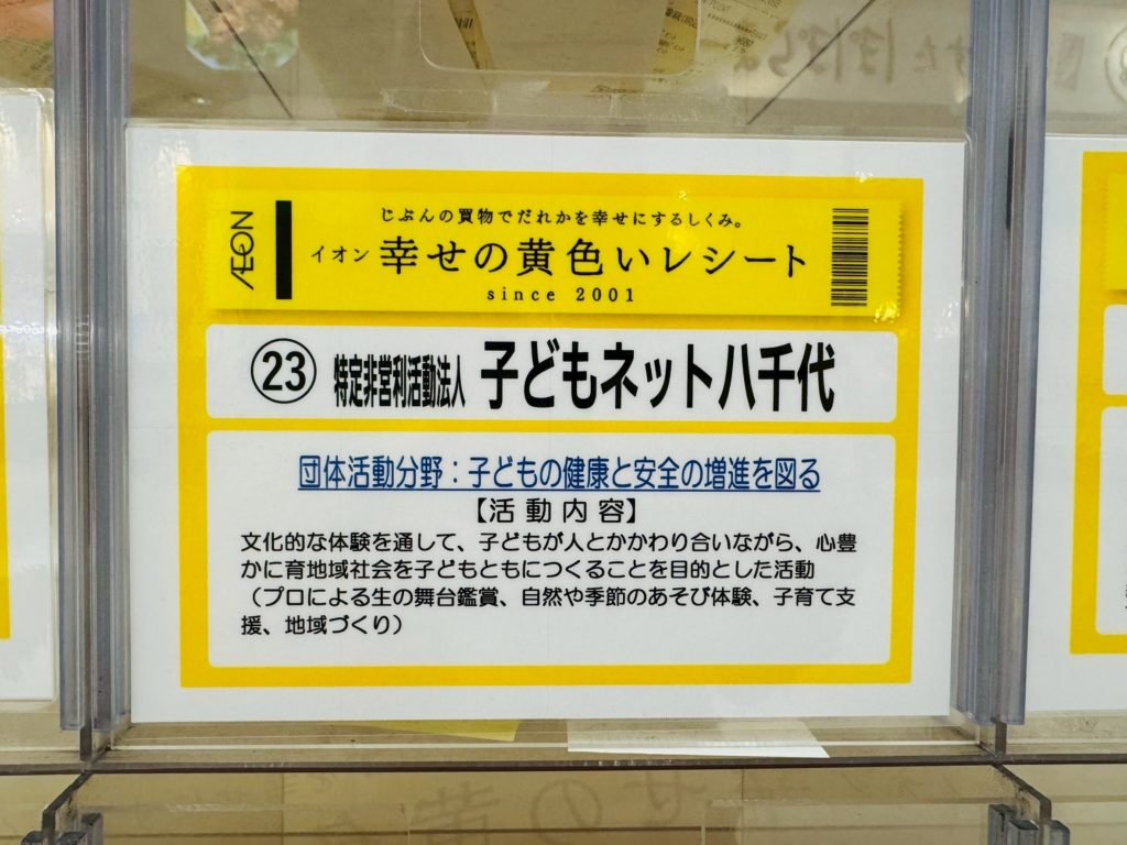 子どもネット八千代のBOXに黄色いレシートを投函してくださった皆さま、そして、投函の声かけや膨大な量のレシートの大変な仕分け作業をしてくださった、イオンモール八千代緑が丘の皆さまに厚く御礼申し上げます。