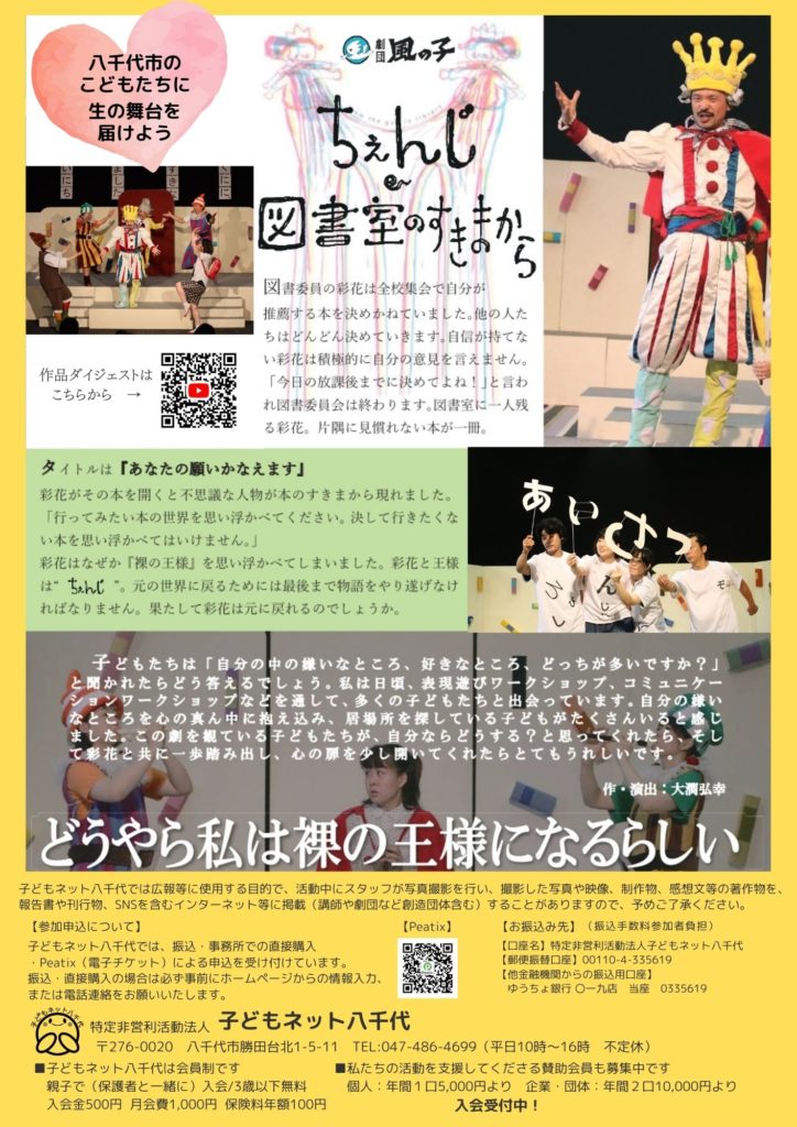 ※子どもネット八千代では広報等に使用する目的で、活動中にスタッフが写真撮影を行い、撮影した写真や映像、制作物、感想文等の著作物を、報告書や刊行物、SNSを含むインターネット等に掲載(講師や劇団など創造団体含む)することがありますので、予めご了承ください。