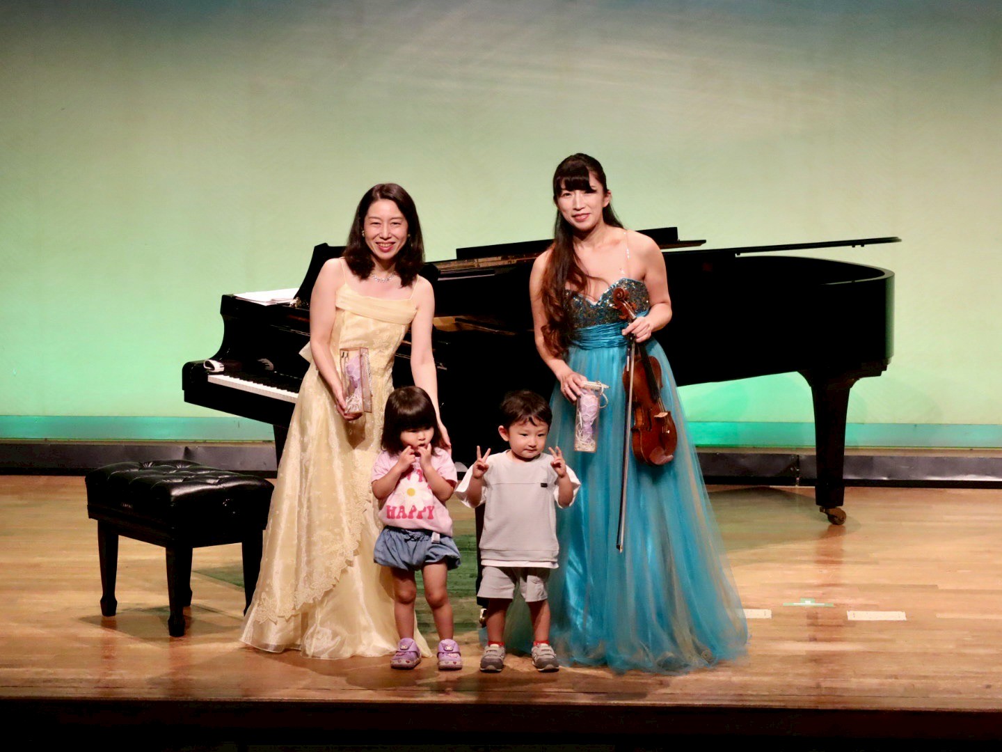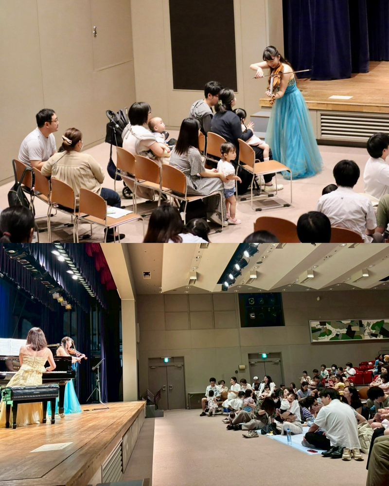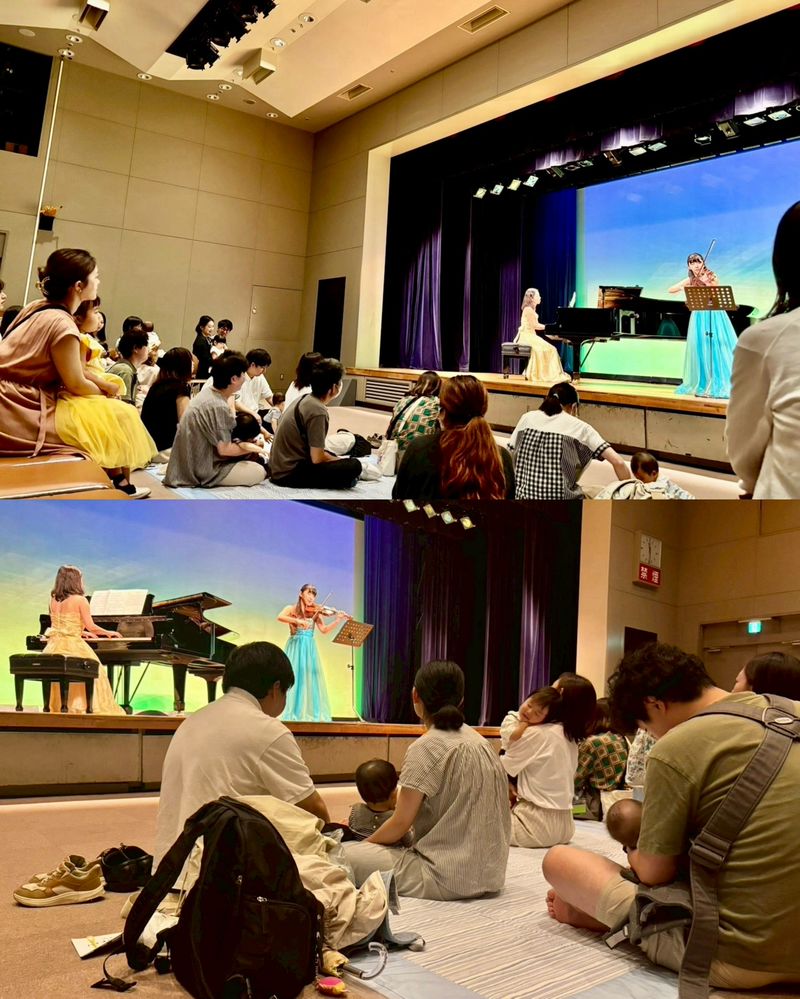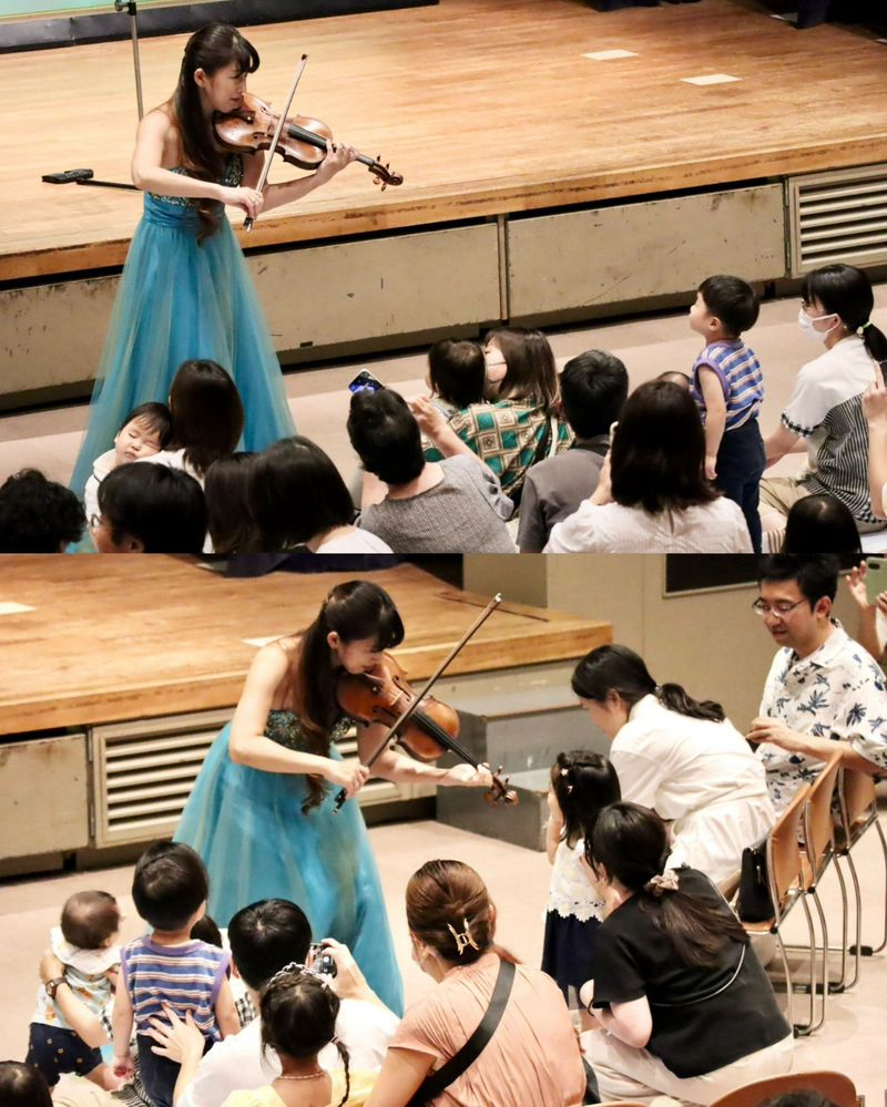 椅子に座ったり、桟敷に座ったり、お母さんやお父さんに抱っこしてもらったりしながら、生まれて初めてバイオリンとピアノの生演奏を聴きました。