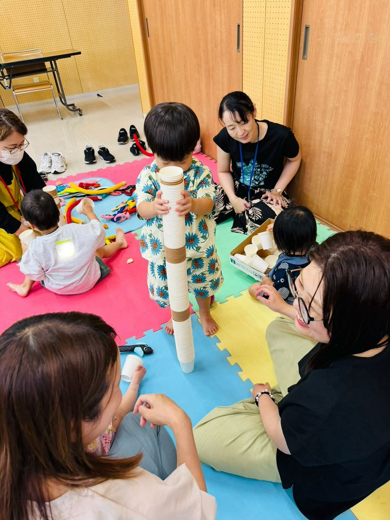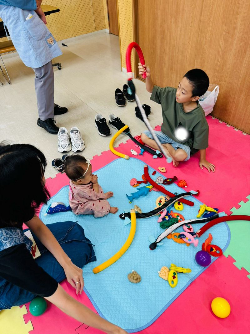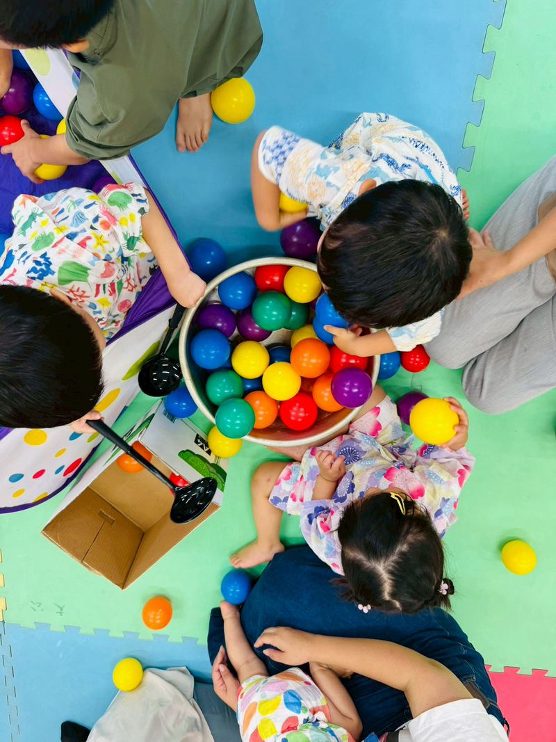 7月回の縁日あそびは、たくさんの0.1歳児親子にお兄ちゃんお姉ちゃんも加わって、室内はとってもにぎやかになりました❗️