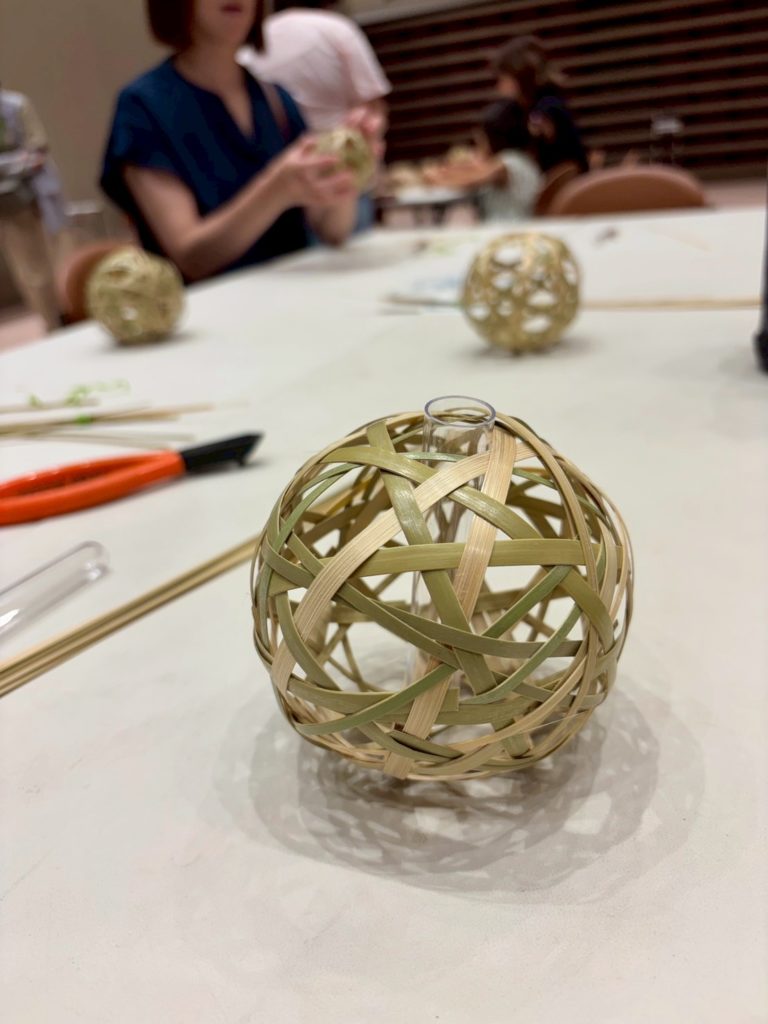 この竹ボールは、紐を通してぶら下げる飾りにしたり、試験管を入れて一輪挿しにしたり、小さなLEDライトを入れて灯りにしたり・・・色々な楽しみ方が出来るそうです。