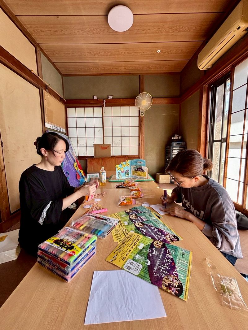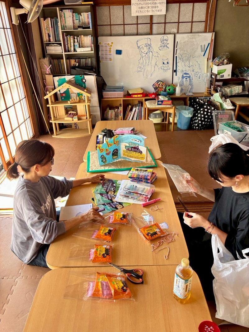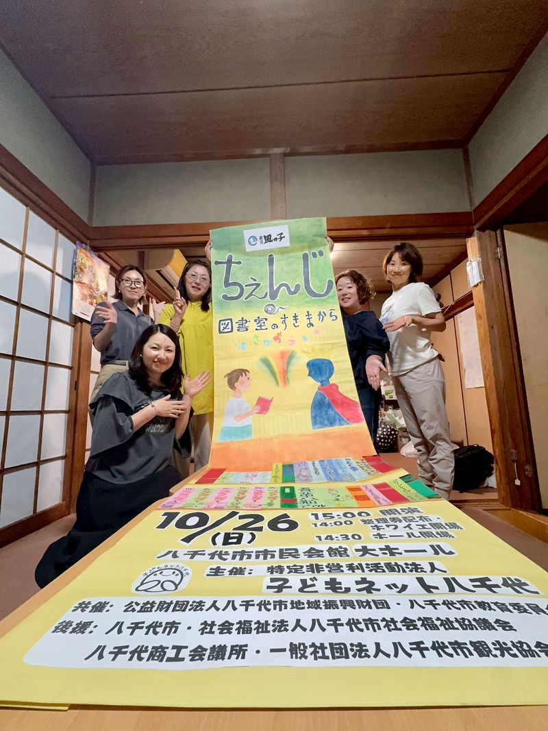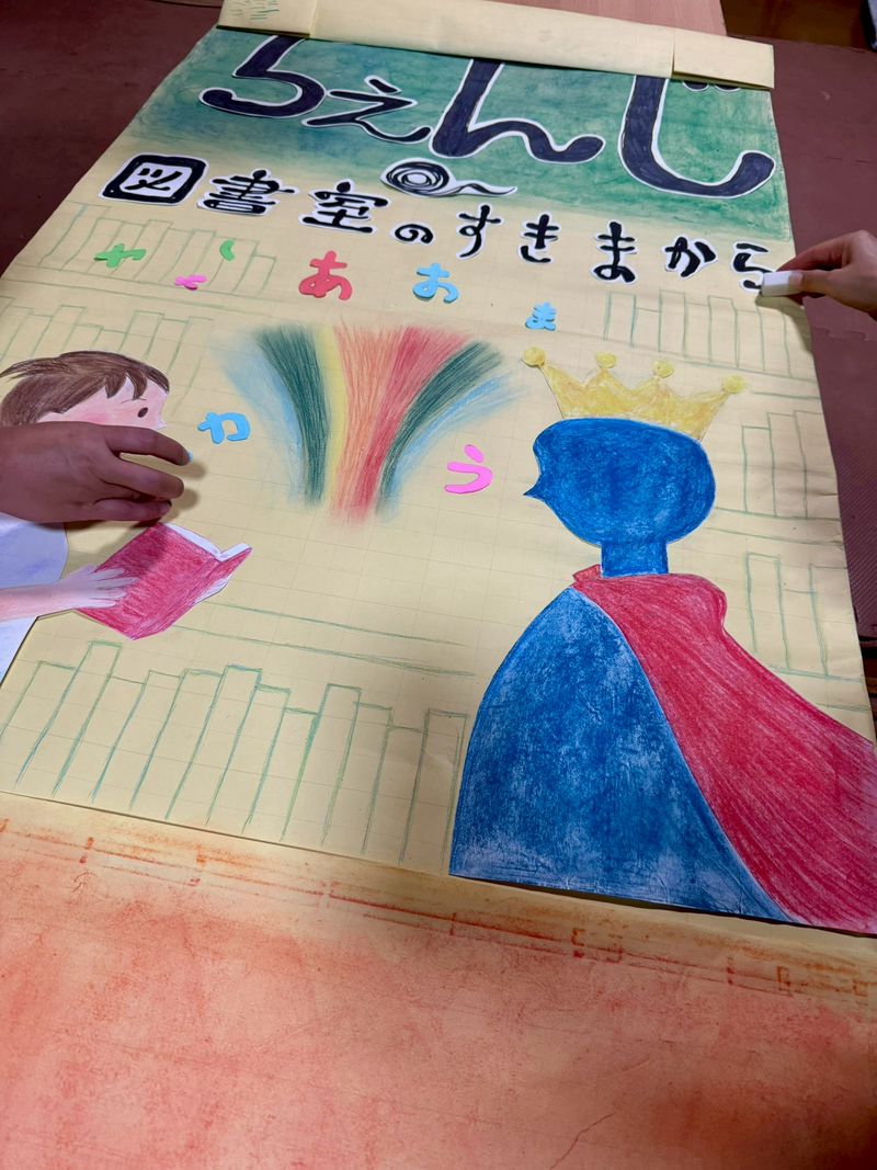 この日は子どもネット八千代会員からたくさん集めて制作部のフォトスポットに貼りきれなかった本の背表紙を看板に貼り本棚を描きました🙏