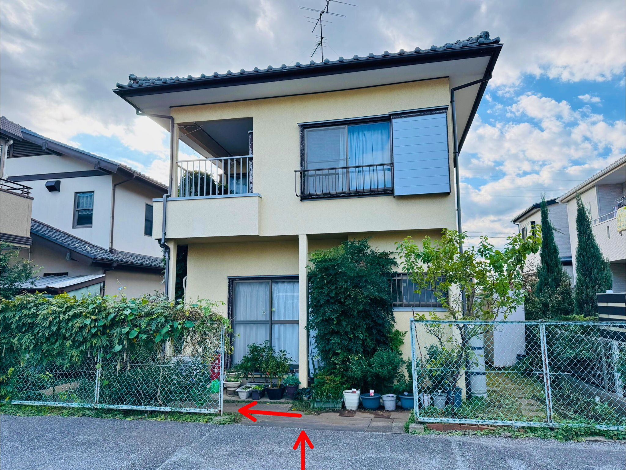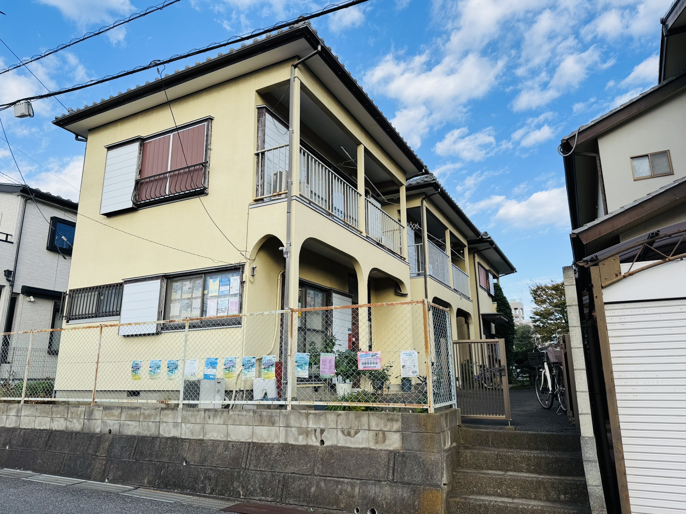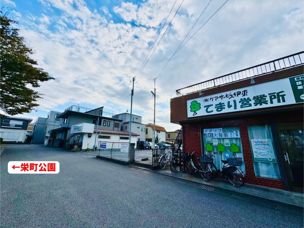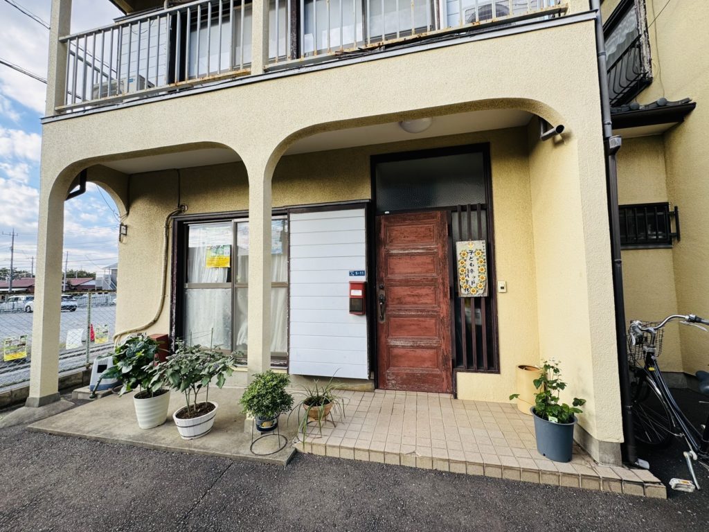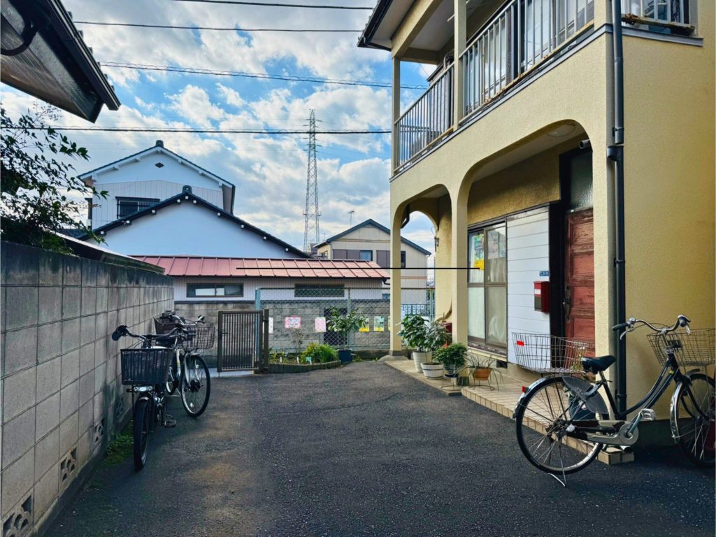 左側からまわり込むと、3軒目一番奥が子どもネット八千代の事務所です。(看板があります。)