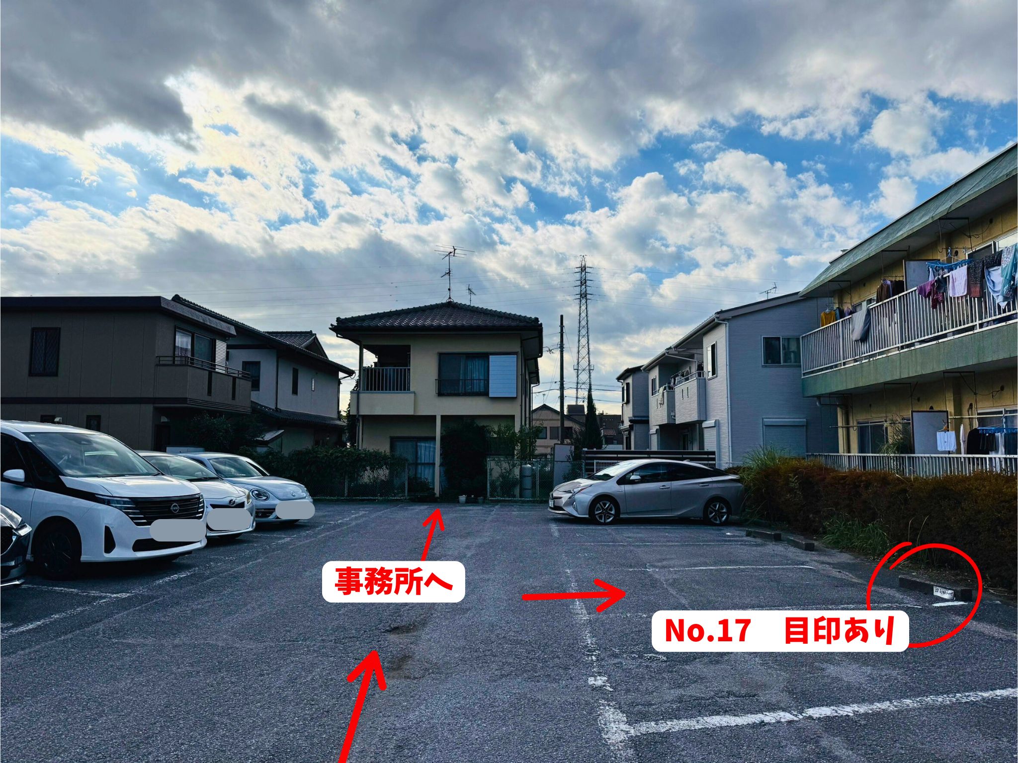 入り口から向かって右側の列の奥から4番目「No.17」が子どもネット八千代の駐車場です。