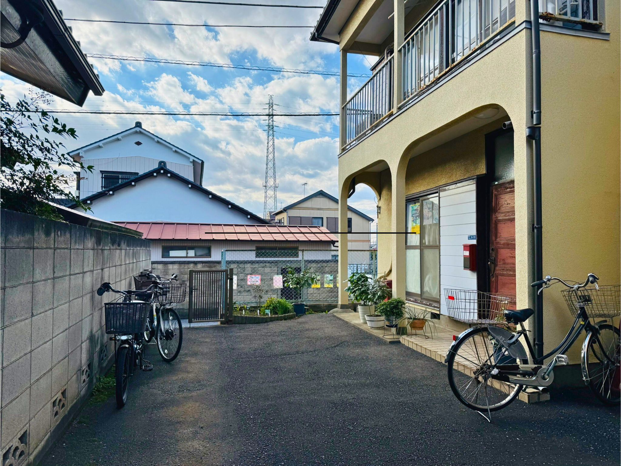 そのまま駐車場の奥にある庭のある長屋に進んでください。