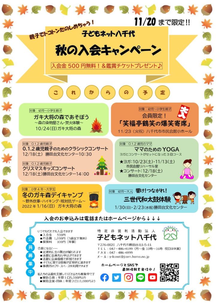 お知らせ 11/20まで入会キャンペーン中!! 👉11月20日までにご入会いただくと・・・ 💜入会金500円無料 💜鑑賞チケットをプレゼント 💜11月23日の会員限定の小学生以上対象の鑑賞会「笑福亭鶴笑のおまかせ爆笑寄席」も見られます✨ 子どもネット八千代は、「文化的な体験を通して子どもが... 2021年10月9日