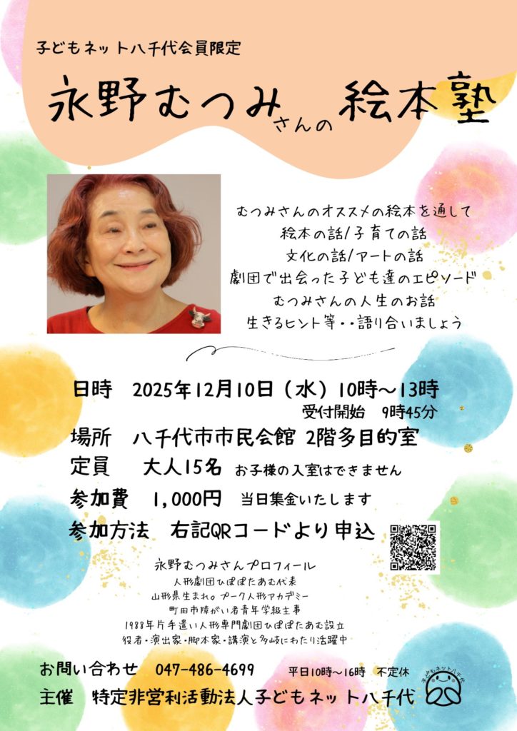 つながる 【子どもネット八千代会員限定】永野むつみさんの絵本塾 2025年12月10日(水) 10時〜13時 八千代市市民会館 人形劇団ひぽぽたあむ代表の永野むつみさんと、お気に入りの絵本を1冊ずつ持ち寄り、語り合いましょう❗️絵本の話、子育ての話、文化の話、アートの話、劇団で出会った子ども達のエピソード、むつみさんの人生のお話、生きるヒント・・・今回は... 2025年10月12日