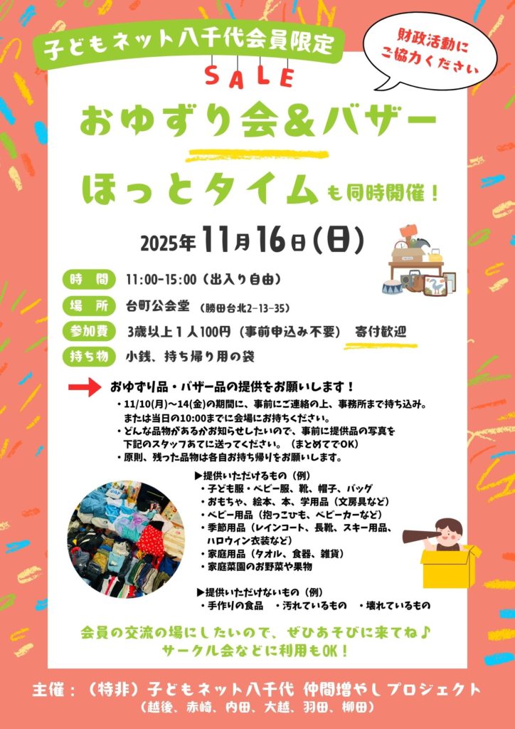 つながる 【子どもネット八千代会員限定】「おゆずり会&バザー」「ほっとタイム」同時開催! 2025年11月16日(日) 11時〜15時 台町公会堂 会員の交流の場にもしたいと思っています❗️ぜひあそびに来てください♪おゆずり品・バザー品の提供もよろしくお願いします❗️ 【日時】2025年11月16日(日)【会場】台町公会堂 (勝田台北2-13... 2025年10月14日