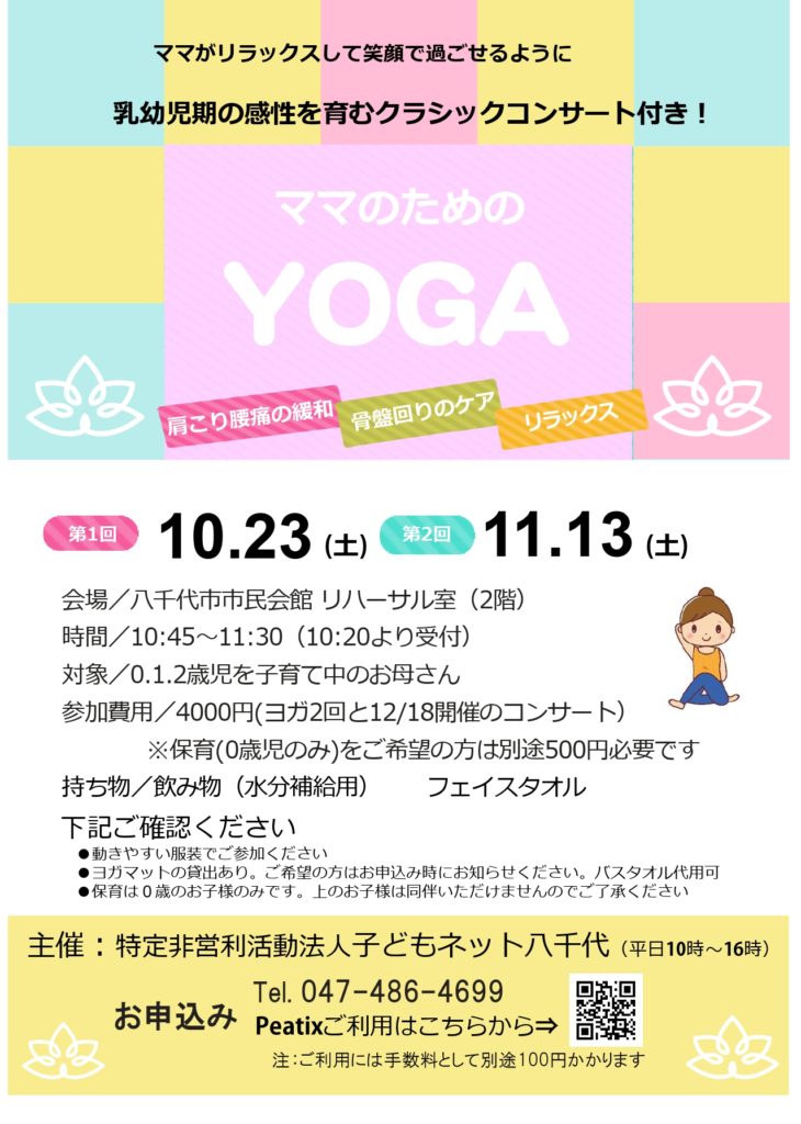 つながる ママのためのYOGA 2021年10月23日(土)・11月13日(土) ヨガ2回と12月18日(土)開催の「0.1.2歳児親子のためのクラシックコンサート」のセットです。(ヨガのみの参加はできません。)... 2021年9月25日